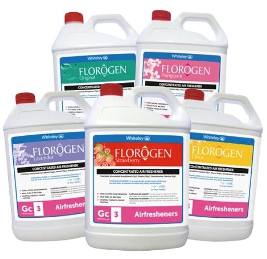 Florogen is a specially formulated, alcohol-based, surface and space deodorant. Florogen removes unwanted odours and provides a positive method for increasing hygiene in the immediate area of use. The Florogen air freshener range is available in 5L, with five great fragrances – Original, Lavender, Frangipani, Strawberry and Citrus.